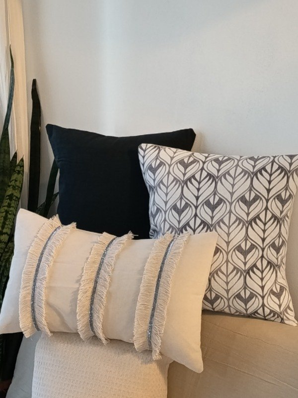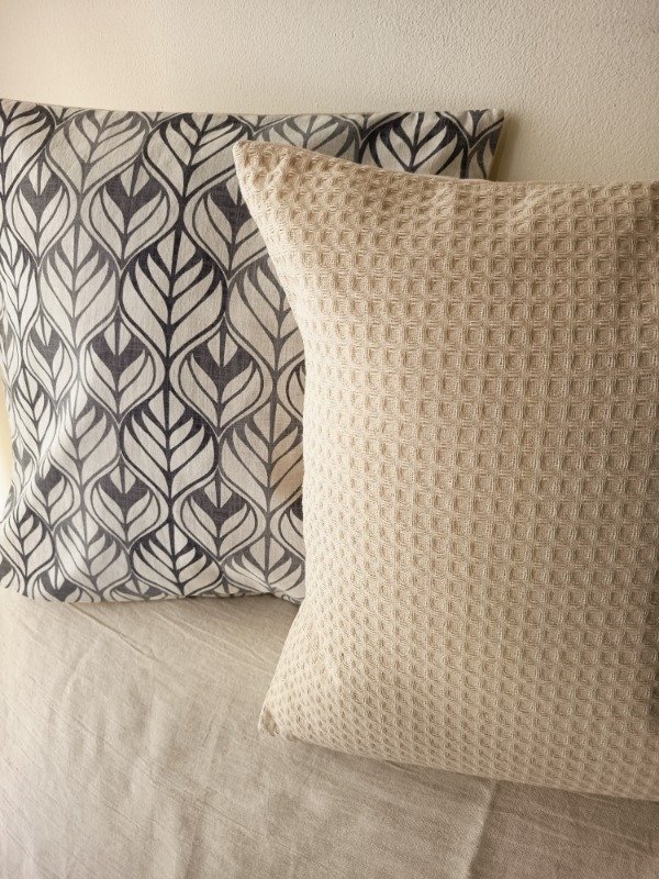 Set de 3 almohadones realizados en Tusor, gabardina, nido wafle con cruce de lienzo natural